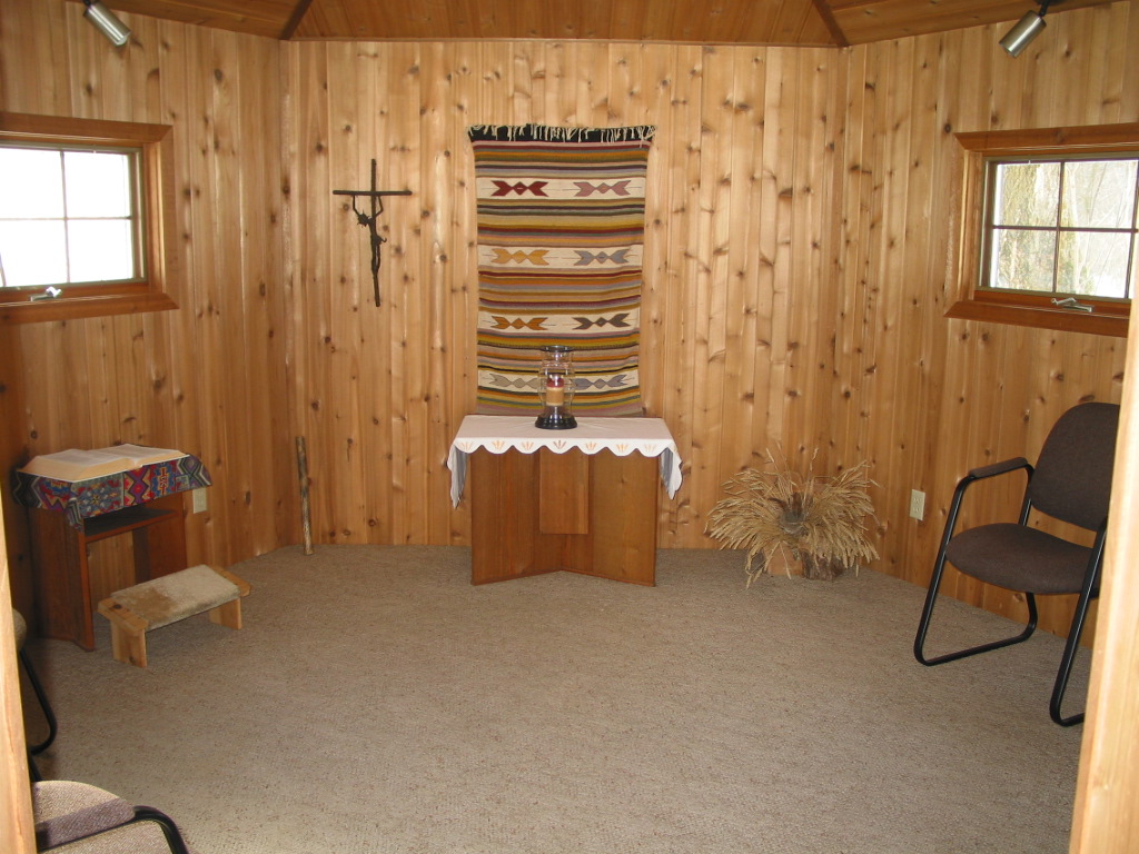 The small beautiful cedar chapel nestled in between the trees offers guests a warm and comfortable place of quiet prayer and reflection.